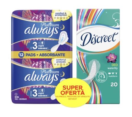 Pachet Absorbante Always Platinum Ultra Night, 12 bucati si Absorbante zilnice Discreet, 20 bucati, P&G